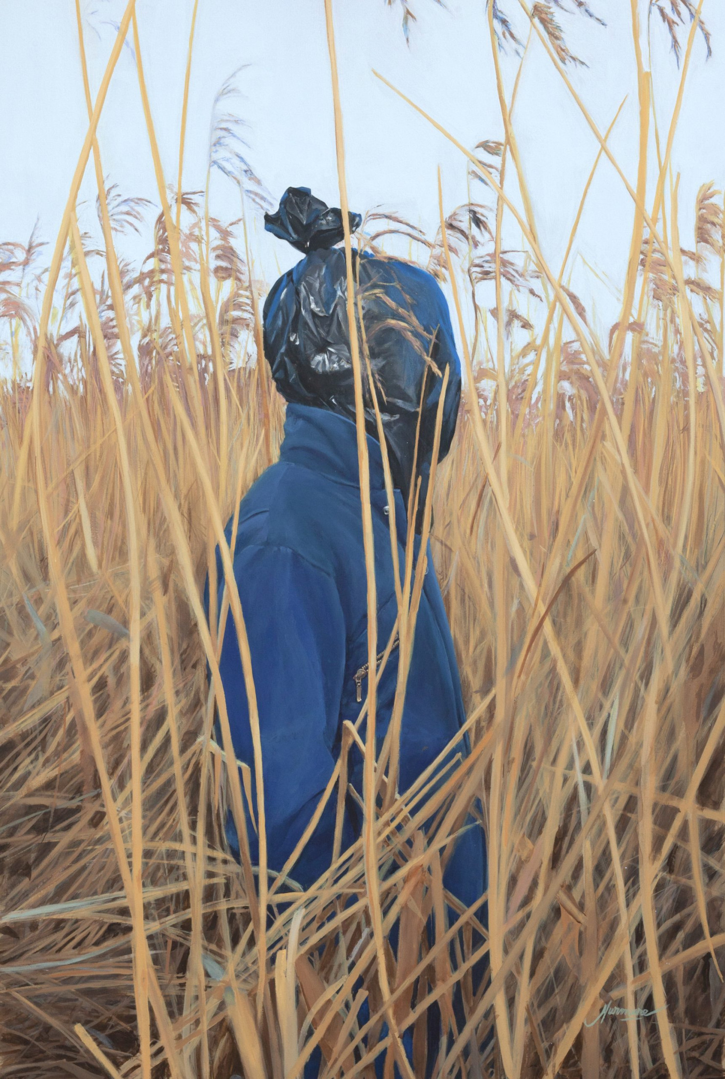 The artwork is based on a blurred background done with graphite pencil. With his ethereal render, it contrasts with the garbage bag whale with a much more brutal stroke. The lightness of the landscape emphasize the difference with this zoomorphic consumption object.
