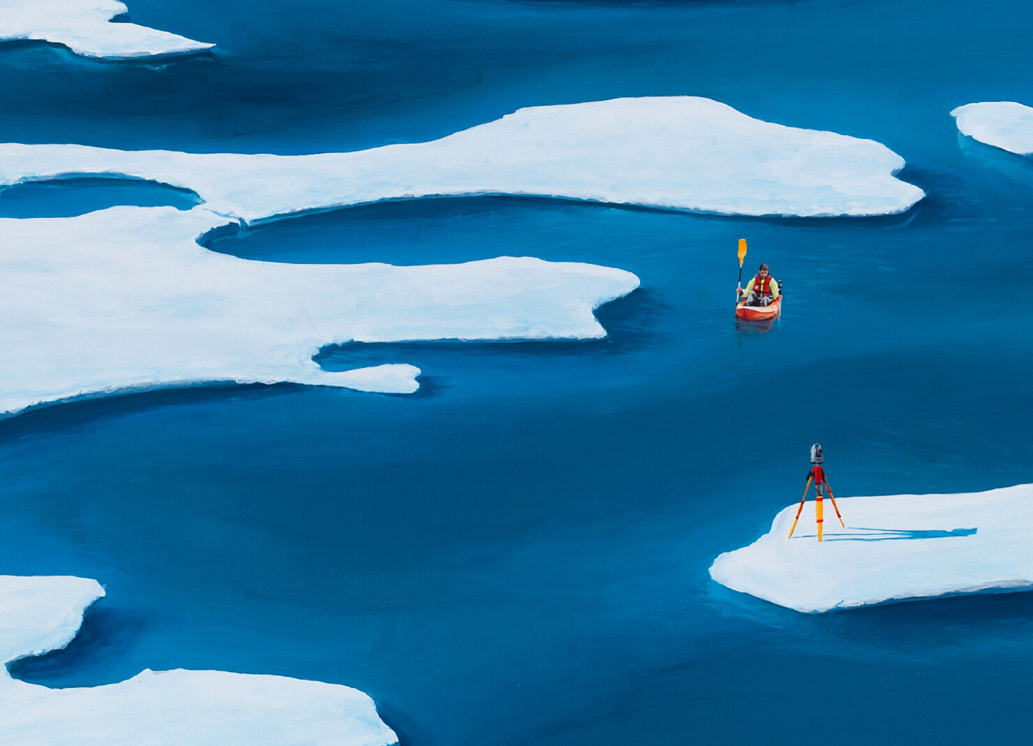 This artwork highlights how precious and fragile the ice floe is. The outer dark blue makes the ice pop like an emerald in a jewel box. The beauty of the setting is « polluted » by the presence of people just enjoying their holidays with no regard for the impact on this environment essential to our planet and that will affect millions of people around the world if not protected.
