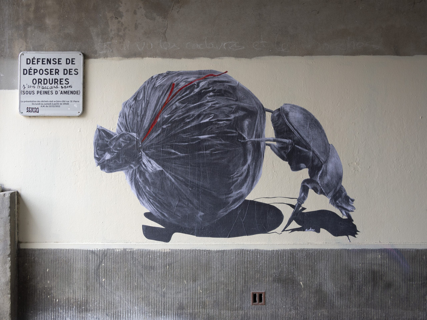 This scale 1 paste-up is the first in the “Saynètes” series that puts in perspective in a surreal way Man and his relationship to pollution and the proliferation of waste that he creates.